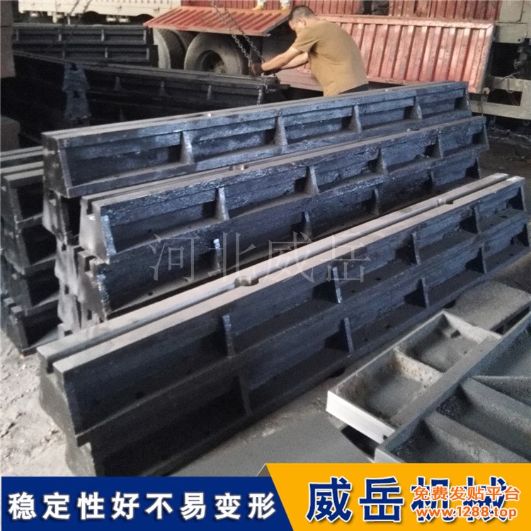 铸铁地轨--T型槽地轨主要用于大型设备的装配、试验、铸铁和检验.这样不用做成大型的平台,地轨具体规格可根据需方图纸制作或双方商定生产加工。根据设备的固定点来设计、拼接成铸梁平台。即节省了材料成本,又可以占用很小的空间,可谓是性价比很高。完全可以替代大型装配平台、铸铁平板、装配平板等,能够满足冶金设备、建材设备、矿山设备、造船等大型设备制造、组装、装配等工作。度铸铁HT200-300工作面硬度为HB170-240经过两次人工处理(人工退火600度-700度和自然时效2-3年)使该产品的精度稳定,耐磨性能好。铸铁地轨长度规格可以做成500mm4000mm以内的各种规格。外形尺寸、每米长度重量要根据客户要求承重来确定,威岳公司免费为客户设计图纸、提供前期服务!多年来,我公司以合理的、高品质的产品、周到的售后服务赢得了市场的信誉。同时为了方便用户,可根据客户要求加工订做各种铸件、非标准量具地梁、T型槽铸铁地轨、十字槽铸铁平台、铸铁试验平台等产品。